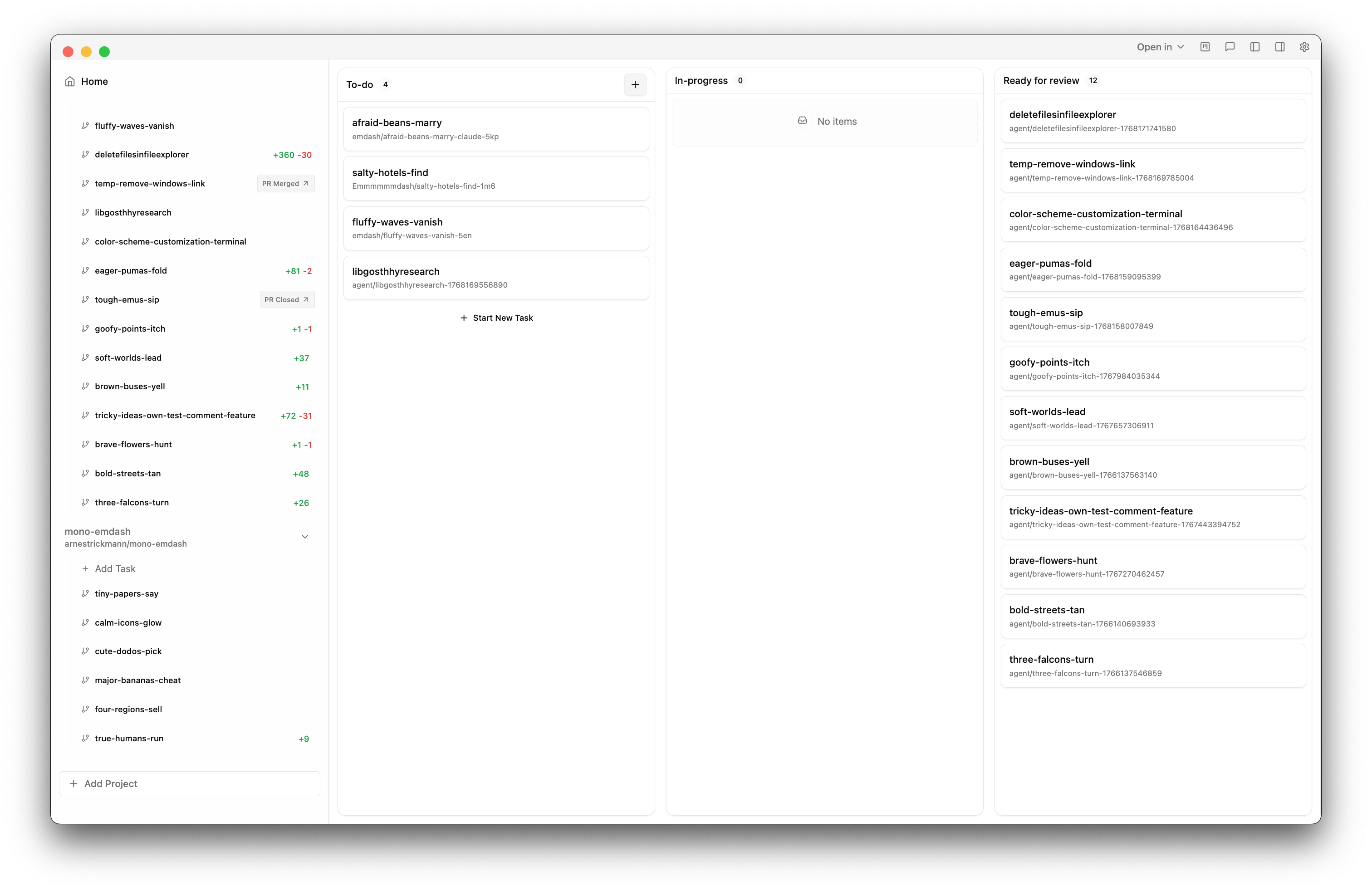- When an agent finishes (terminal exits, changes detected, or PR created), the task moves to Ready for review