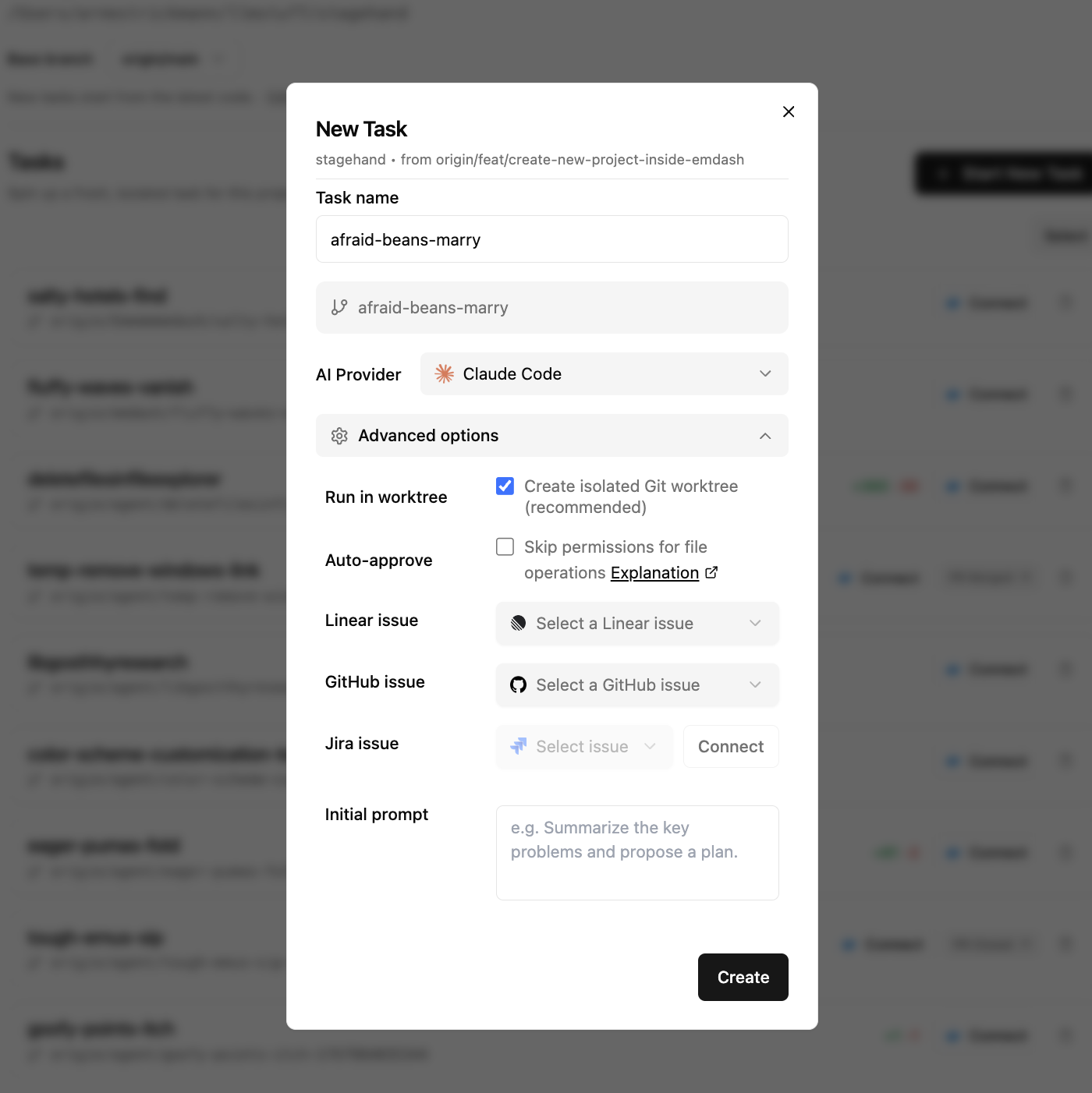 ⌘N - Enter a name (or let Emdash auto-generate one)